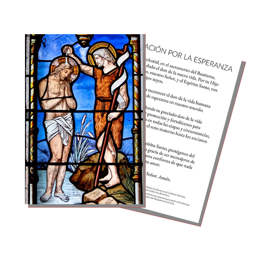 Esta oración nos recuerda que, mediante el sacramento del Bautismo, recibimos la esperanza de una nueva vida en Cristo. Está disponible como estampa con una imagen en vitral del Bautismo de Cristo.