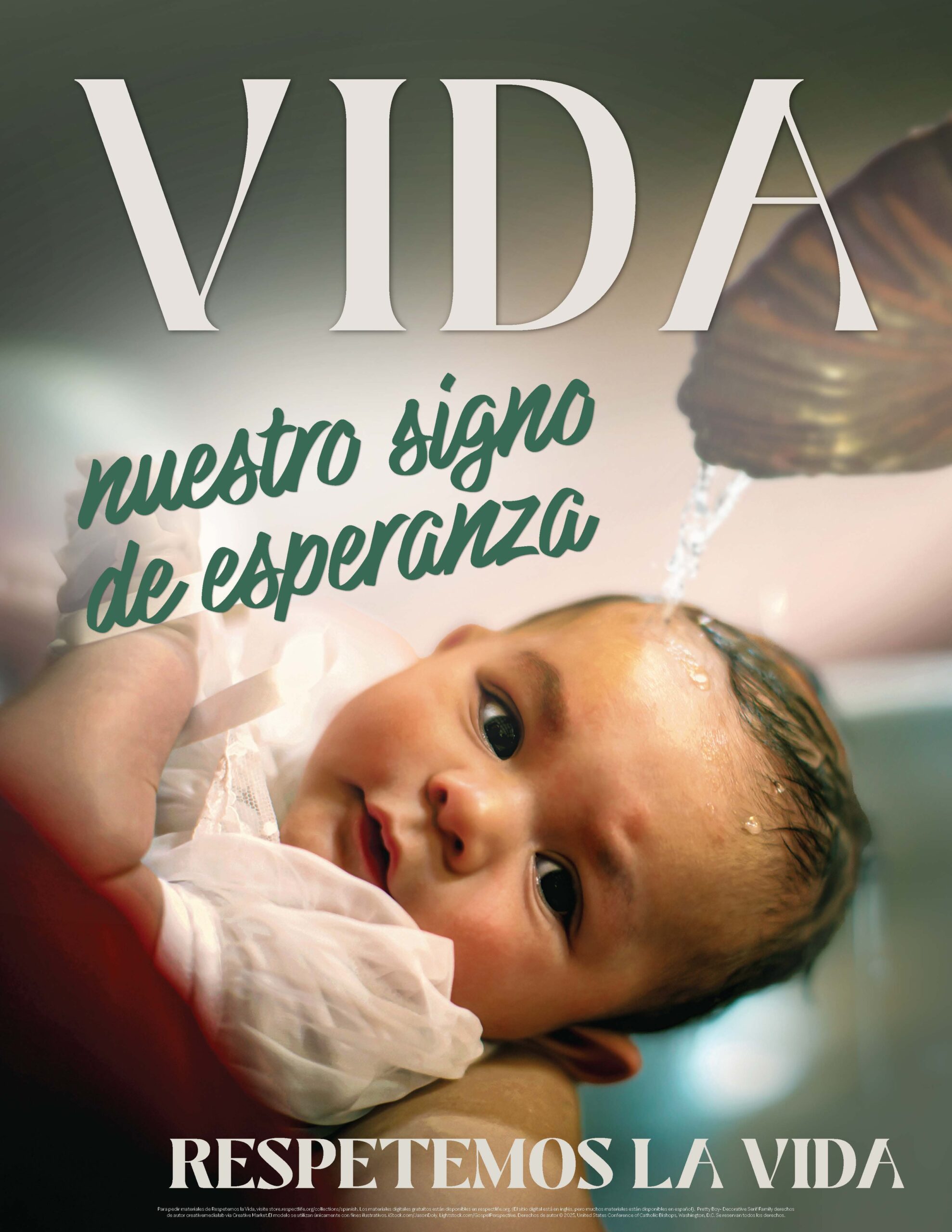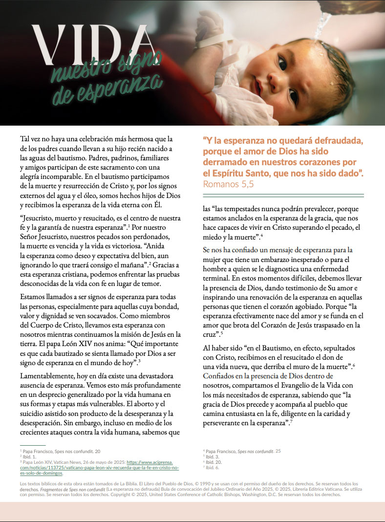 El cartel de Respeto a la Vida 2025 presenta la imagen de un bebé recibiendo el sacramento del Bautismo. El mensaje, “Vida: Nuestro Signo de Esperanza”, refleja el Año Jubilar de la Esperanza en curso. Mediante el don de nuestro Bautismo, Nuestro Señor Jesucristo nos llama a ser miembros de su Cuerpo, demostrando así la inestimable dignidad de la persona humana. Este misterio nos invita a ser testigos de la esperanza de la resurrección, promoviendo y defendiendo el precioso don de la vida.