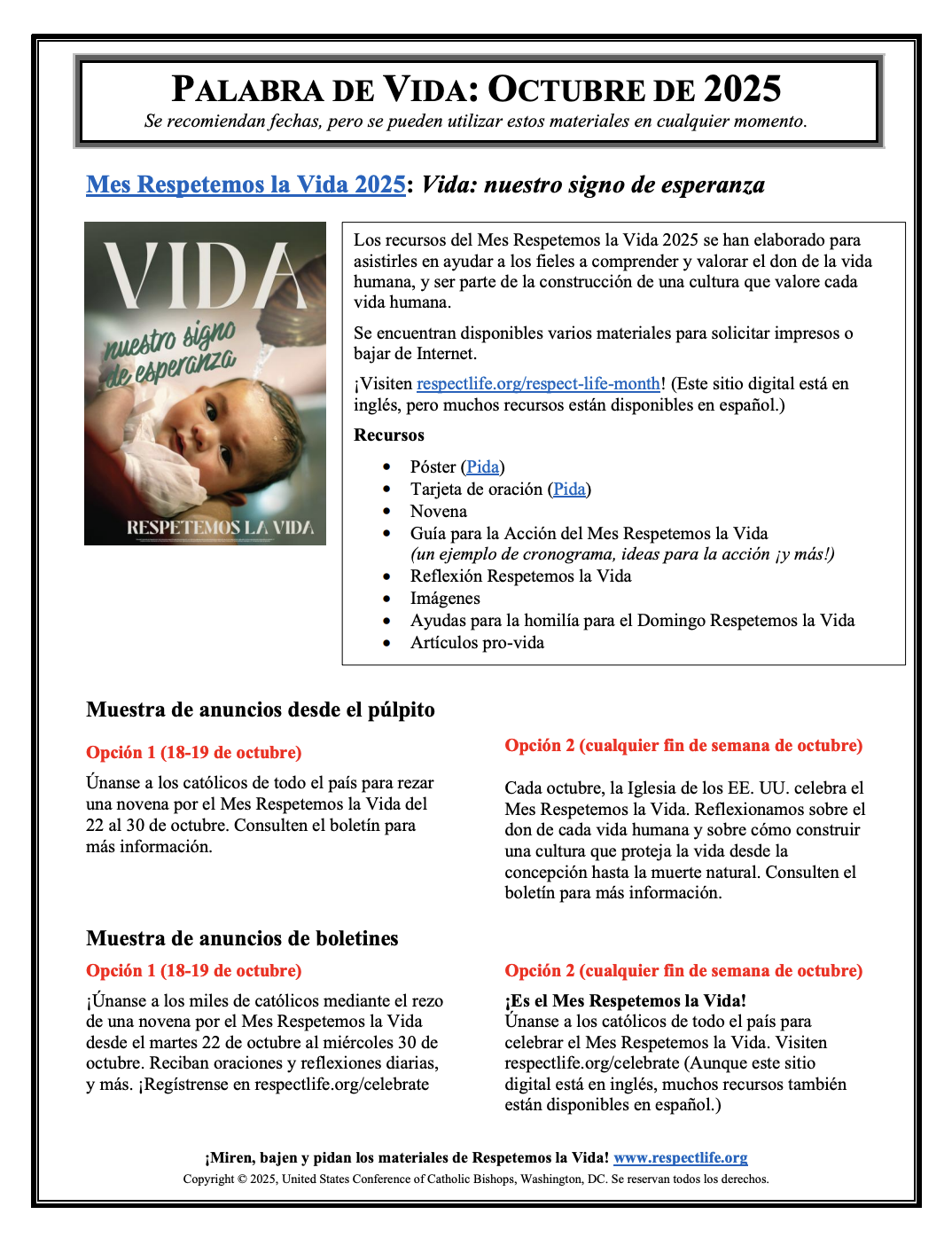 Palabra de Vida es un recurso mensual para diócesis y parroquias que incluye artículos especiales, intercesiones por la vida, citas para boletines, ilustraciones para boletines y más. La edición de octubre incluye recursos para el Mes del Respeto a la Vida.