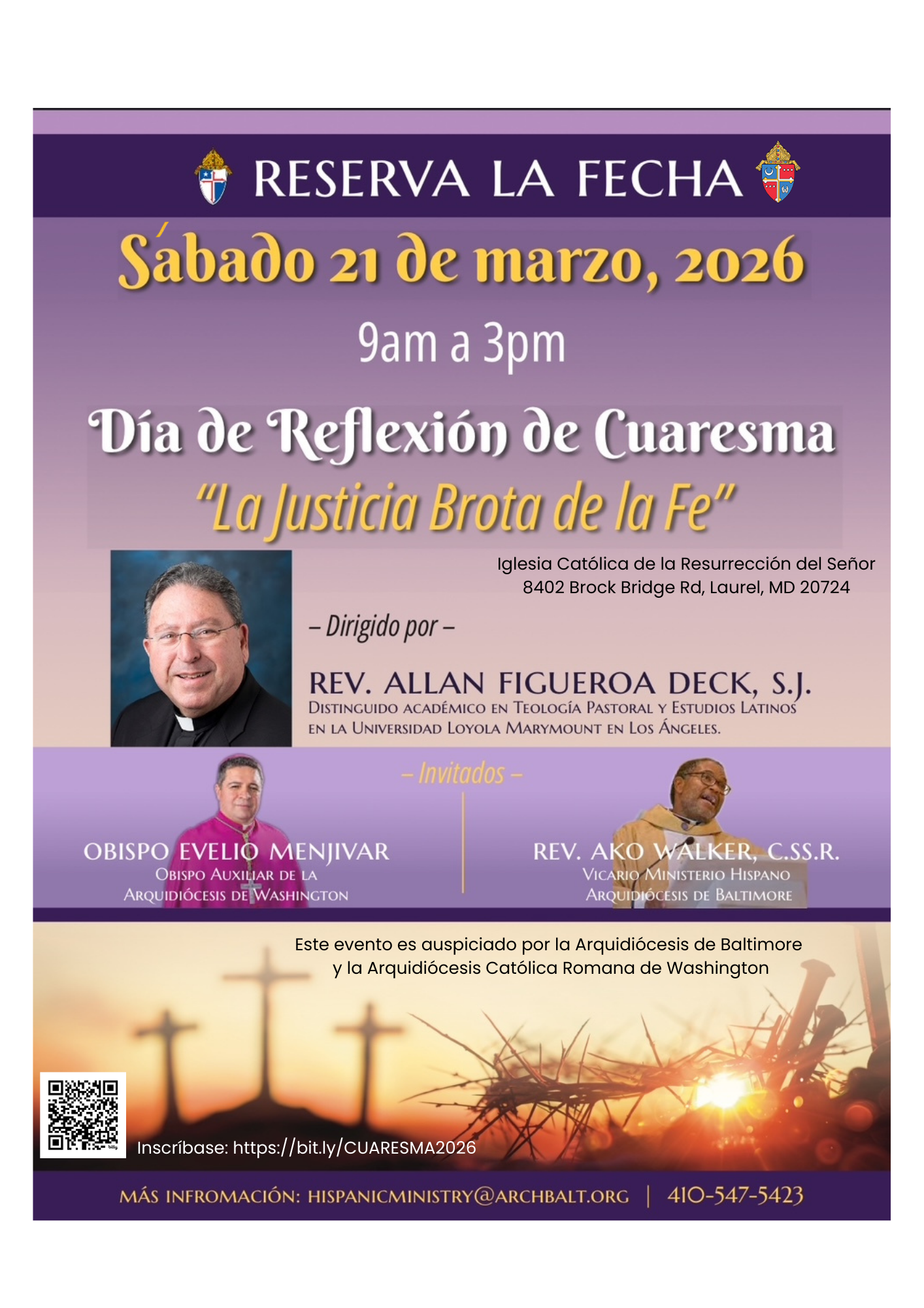 The Archdiocese of Washington and the Archdiocese of Baltimore invite you to a Lenten Day of Reflection, “Justice Flows from Faith,” led by Rev. Allan Figueroa Deck, SJ, and inspired by his book Justice Flows from Faith. The event will take place on Saturday, March 21, 2026, from 9:00 a.m. to 3:00 p.m. at the Church of the Resurrection of the Lord in Laurel, MD. This day of prayer and formation is designed to deepen the connection between the Eucharist, faith, and justice, and to equip participants to form small faith communities committed to communion, mission, and human dignity. To register, click here. For further details, download the flyer here. This event will be held in Spanish.
